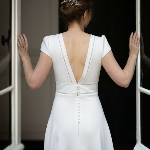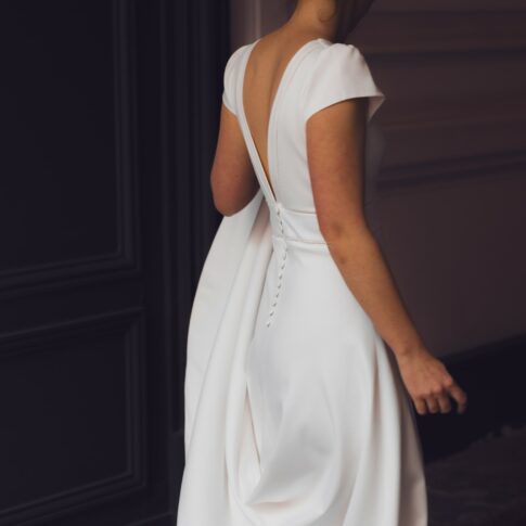 Robe de Pauline Robe en crêpe lourd, avec un drapé de soie crinkle noué sur le devant et des manches souples. Dans le dos, une cape amovible en crêpe de soie mousse. Photos @emmanuelledemontgrand & @coolkidsonthedancefloor Fleurs de tête @florencechardignymodiste