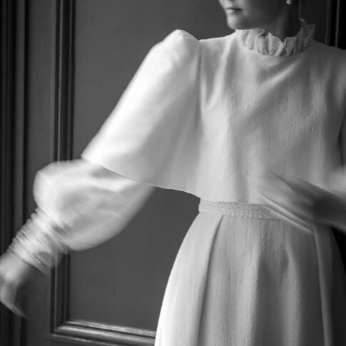 Robe de Marion Robe en crêpe caddy de soie, avec un col et une ceinture froissés. Dans le dos, deux pans amovibles qui forme une traine. Photos @emmanuelledevilmorin