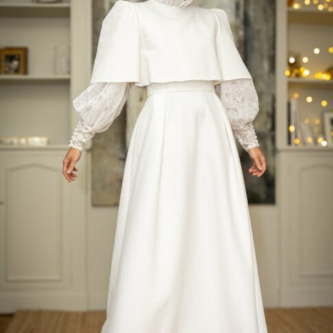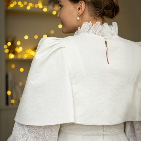 Robe de Lara Robe en crêpe polyester lourd avec des manches courtes et un dos en tulle brodé. Par dessus, une cape en organza de soie toute bordé de galon de tulle brodé. Photos @emmanuelledemontgrand
